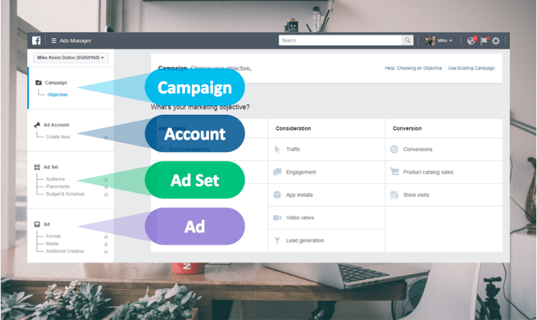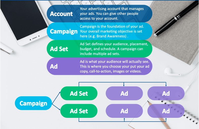 Before you begin with placing Web Design Facebook Ads, knowing and familiarising yourself with how the campaigns are structured, is essential to ease you through the process. When you are aware of the campaign structure, you gain an insight into how your Ad will run over the face of the internet. Here’s the structure of Facebook Advertising;